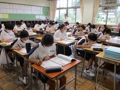 本日は1年2組で教務主任の先生が実施する様子を担任の先生方が参加し、来週から他の学級でも同じように始めるそうです。